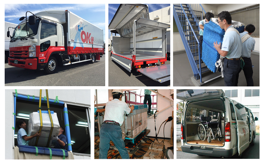当社の輸送サービス事業は、オフィスビルへ大型機械の搬入・組み立て・設置や、小売店舗様への什器の搬入・設置、また回収もいたします。加えて個人宅への家具の搬入、組み立てなど、商品の知識と技術をそなえたドライバーを養成し、高品質の輸送サービスを実現しております。